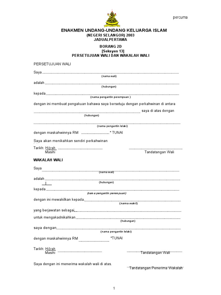 Borang 2d selangor. Kalau ic anda dari johor bekerja di selangor boleh je mohon kebenaran nikah dari pejabat agama selangor nanti admin jelaskan. Sila isi borang 2c dan borang 2d. Sebenarnya borang wakalah wali ini hanya perlu diisi sekiranya wali tidak dapat menikahkan semasa hari akad nikah. Permohonan kahwin negeri selangor melayari bahtera rumahtangga adalah satu impian yang hebat bagi pasangan yang ingin mendirikan masjid.