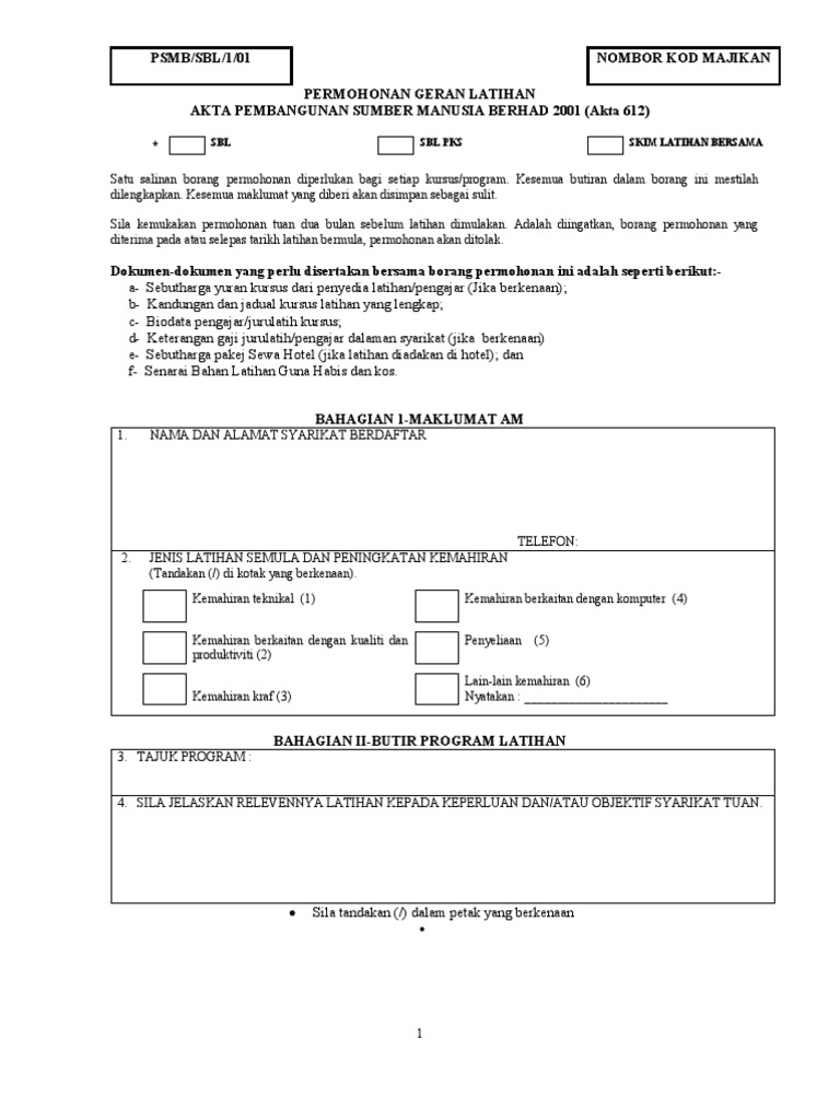 3 2 aplikasi e claim boleh diakses dengan menggunakan login id dan katalaluan yang akan diberikan oleh psmb kepada semua majikan bermula awal september 2014. Sebuah motor 3 fasa 8hp 400vac 50hz 4 pasang kutub faktor kuasa 0 8 bekerja pada kecekapan 85 hitung nilai nilai berikut i. Skim bantuan latihan khas sbl khas skim bantuan latihan khas sbl khas is one of the major schemes under hrdf. Borang ini hendaklah dihantar kepada psmb bersama dengan apa apa dokumen sokongan dalam tempoh 30 hari dari tarikh pertukaran tersebut peraturan 15 peraturan peraturan pembangunan sumber manusia berhad pendaftaran majikan dan pembayaran levi 2001.