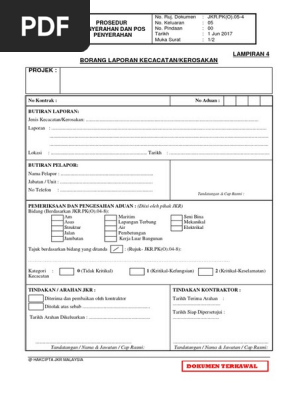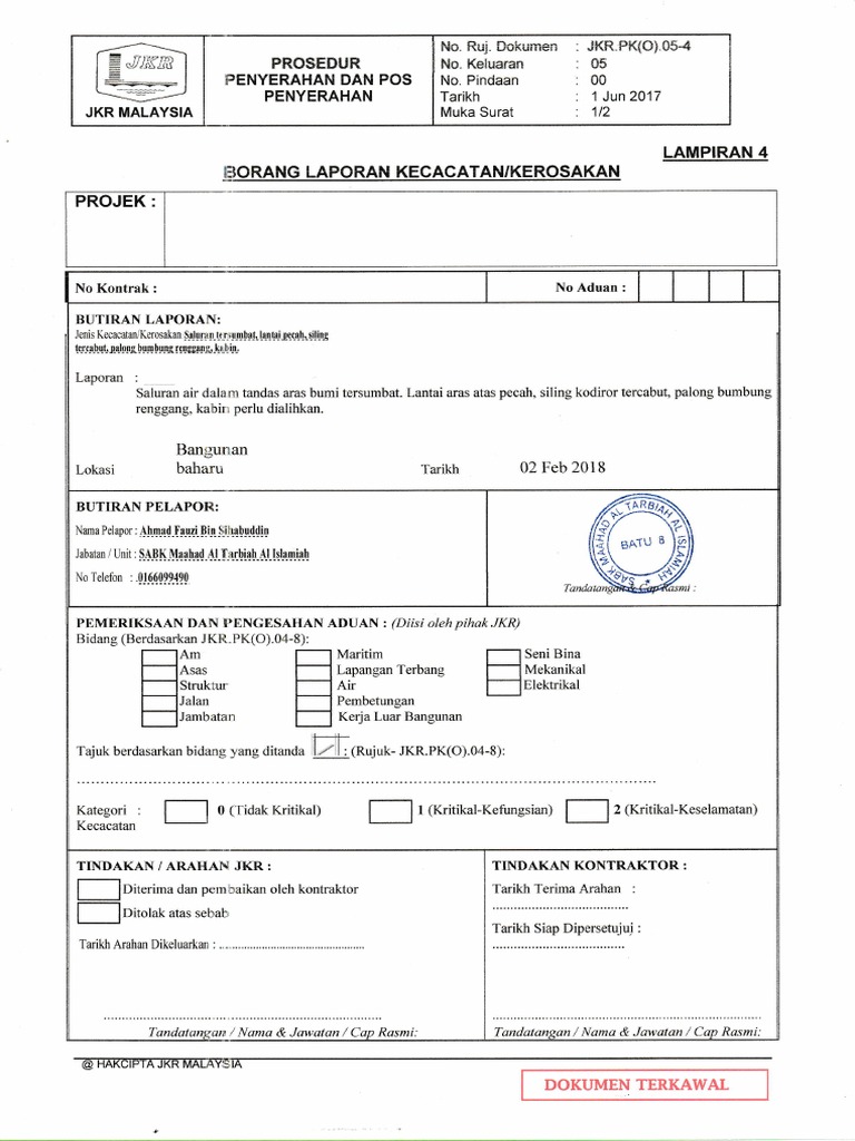 Borang aduan kerosakan bangunan jkr. Sebarang masalah dan aduan berhubung laluan tersebut boleh dibuat melalui saluran seperti berikut. Contoh borang aduan kerosakan bangunan mekanikal elektrikal peralatan dan kelengkapan ppas am 410 lampiran 1 9 2 contoh borang penyelenggaraan kenderaan ppas k 301 lampiran 2 9 3 contoh surat maklumbalas aduan kerosakan ppas am 414 lampiran 3 9 4 contoh borang pengukuran suhu dan kelembapan di ruang bacaan pengguna ppas am 416. Nama pelapor nombor telefon pejabat pelapor contoh. Borang maklumbalas aduan cadangan penghargaan pertanyaan.