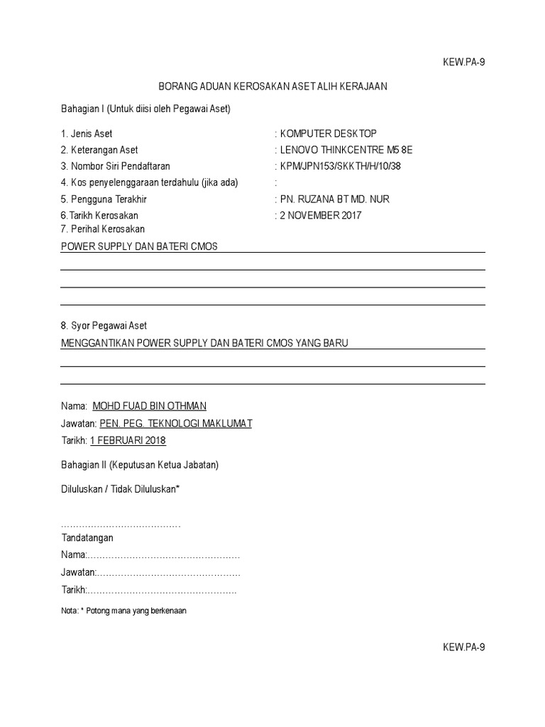 Pesanan rasmi kerajaan beserta. Keterangan mengenai kerja kerja pembaikan termasuk alat ganti yang dibeli. Potong mana yang berkenaan kew pa 10 borang aduan kerosakan aset alih bahagian i untuk diisi oleh pengadu. Bahagian i untuk diisi oleh pegawai aset 1.