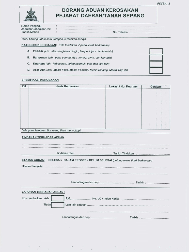 Borang aduan kerosakan mesin. Academia edu is a platform for academics to share research papers. Sumbangan penjaga kos penyenggaraan. Borang aduan kerosakan aset alih kerajaan bahagian 1 untuk diisi oleh pegawai aset jenis aset. Kos penyelenggaraan terdahulu jika ada.