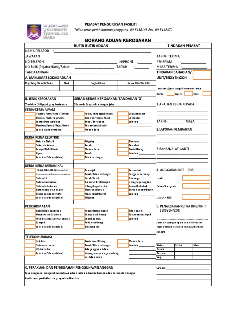 Borang pembaikan dan penyelenggaraan kuaters. Borang aduan kerosakan borang permohonan emel perak borang pembetulan. Tarikh kerosakan peralatan yang rosak. 03 6185 8257 email.