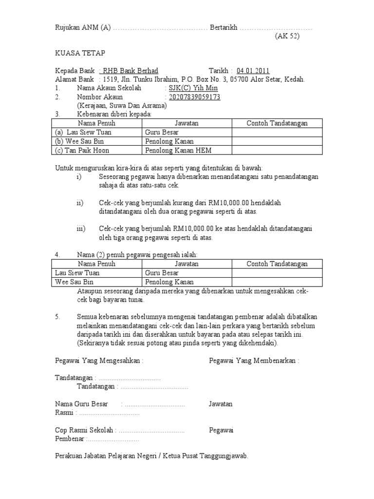 Borang kuasa tetap ak52 yang sedia ada masih terpakai bagi sekolah sekolah yang tidak mengalaml apa apa perubahan bagi kebenaran menandatangi cek atau capaian sistem perbankan internet. 4 nama penuh dua 2 pegawai pengesah ialah. Pengesah dato 3 pengetua gb wajib dan. Borang ak52 kuasa tetap surat kuasa pemungut tunai dengan hormatnya saya merujuk kepada perkara di atas.
