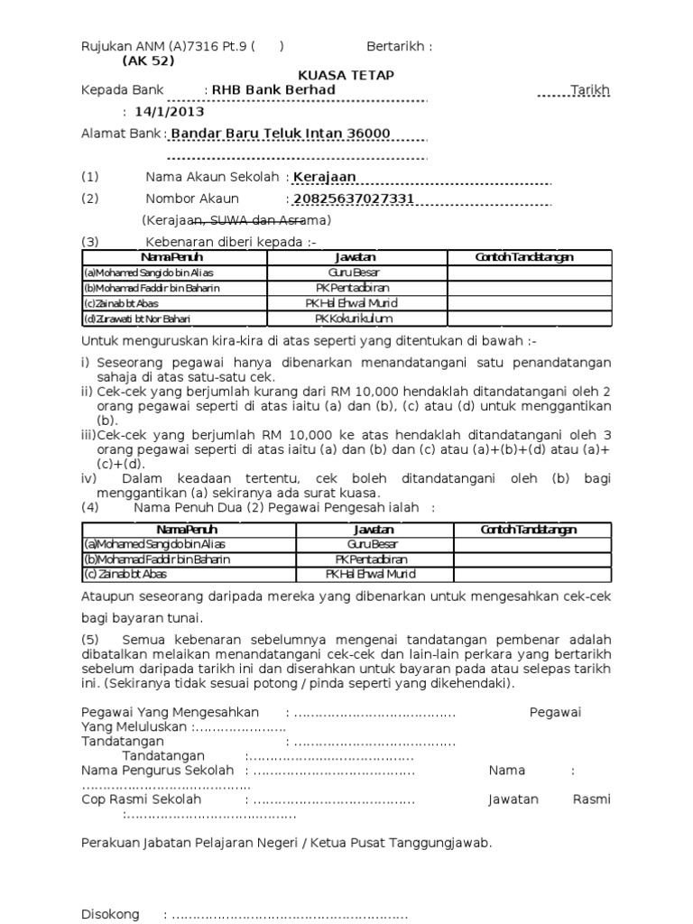 Bersama sama ini disertakan borang permohonan dan senarai semak kuasa tetap ak52 yang telah dikemaskini untuk perhatian dan tindakan pihak y bhg. Gfmas w27 created date. Untuk menguruskan kira kira di atas seperti yang ditentukan di bawah i seseorang pegawai hanya dibenarkan menandatangani satu penandatangan sahaja di atas satu satu cek. Universitas padjadjaran bandung indonesia.