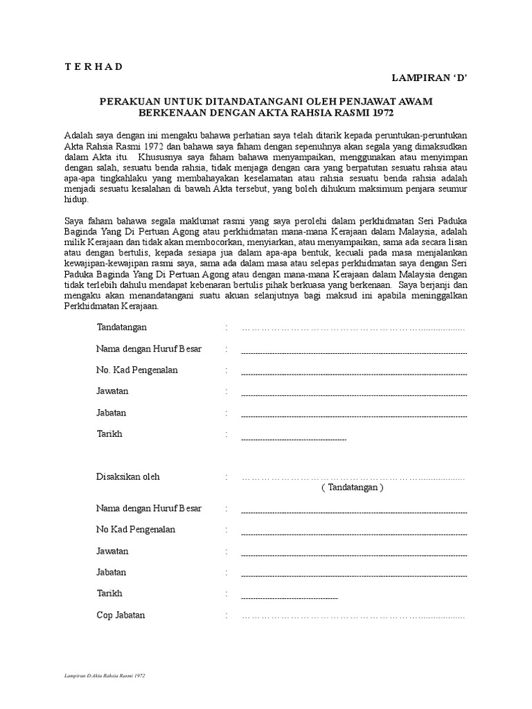 Akta rahsia rasmi 1972 dan bahawa saya faham dengan sepenuhnya akan segala yang dimaksudkan dalam akta itu. Download 104 32 kb click dokumen untuk muatturun. Khususnya saya faham bahawa menyampaikan menggunakan atau menyimpan dengan salah sesuatu benda rahsia tidak menjaga dengan cara yang berpatutan sesuatu rahsia atau apa apa tingkahlaku yang membahayakan keselamatan atau rahsia sesuatu. Borang lampiran d perakuan untuk ditandatangani oleh penjawat awam berkenaan dengan akta rahsia rasmi 1972 january 7 2020 filed under.