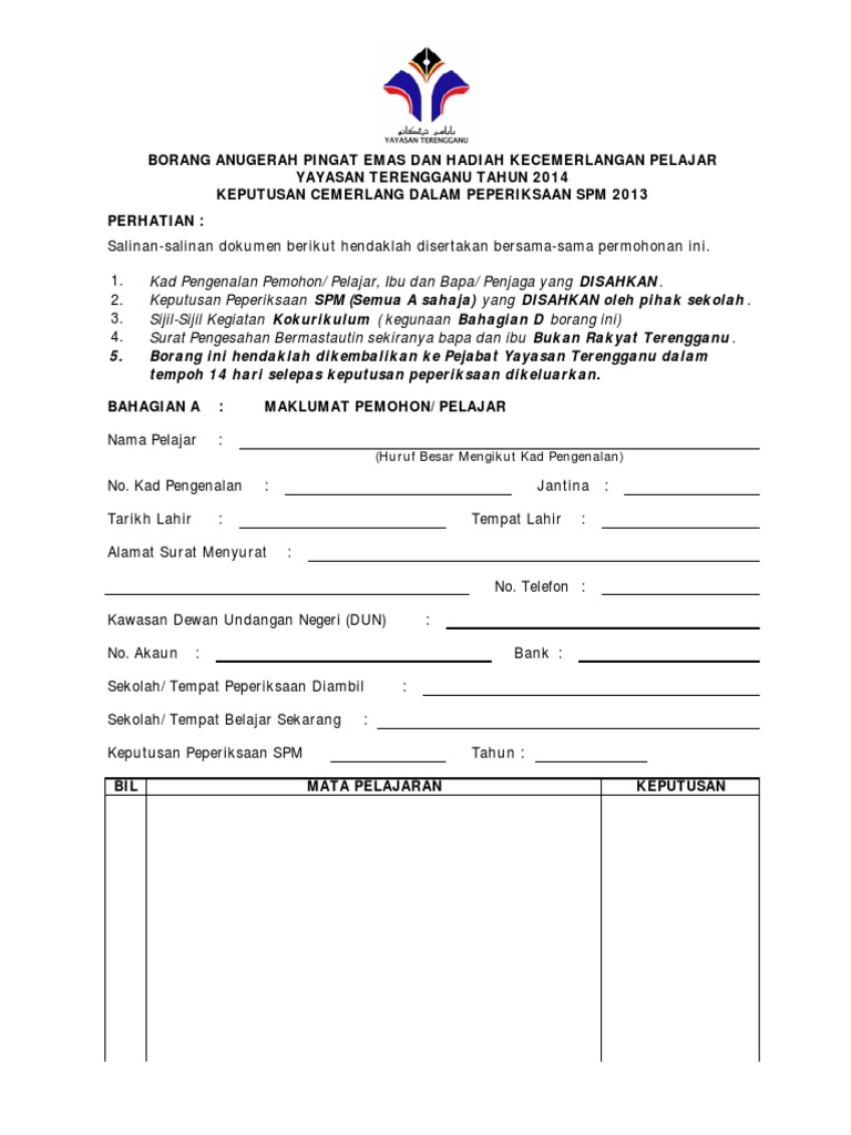 Borang anugerah yayasan terengganu. Yayasan terengganu tidak bertanggungjawab terhadap sebarang kehilangan atau kerosakan yang dialami kerana menggunakan maklumat dalam laman ini. Sila serahkan semua dokumen yang diperlukan di atas untuk semakan dan pengesahan akhir ke bahagian tajaan tingkat 2 yayasan terengganu. Daftar masuk ytklik username. Permohonan bagi kemasukan ke sekolah menengah imtiaz yayasan terengganu terbuka kepada pelajar lepasan yang menduduki peperiksaan upsr.