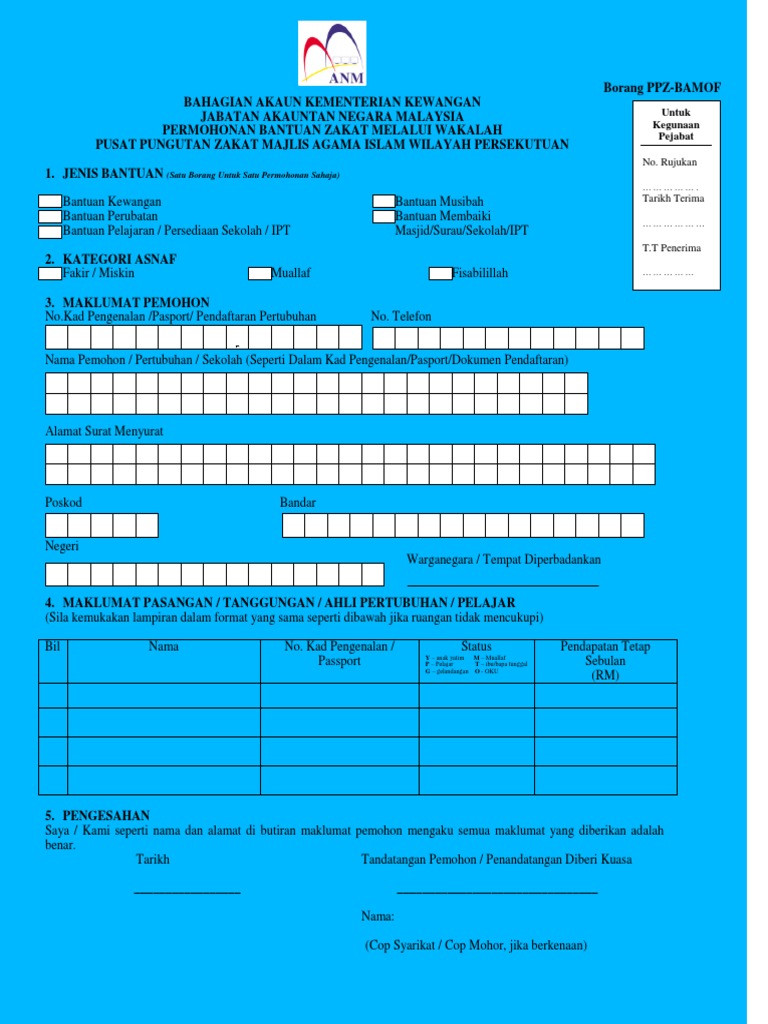Borang bantuan zakat wilayah persekutuan. Borang bantuan jenis skim bantuan zakat. Bagi menentukan asnaf yang layak menerima bantuan zakat di wilayah persekutuan bahagian baitulmal telah menggunakan takrifan asnaf berpandukan kepada mesyuarat jawatankuasa hukum syarak wilayah persekutuan kali ke 51 pada 13 mac 1999. Majlis agama islam wilayah persekutuan aras g 1 7 8 9 10 11 19 20 22. Pembangunan asnaf 1 bantuan kewangan bulanan 2 bantuan aidilfitri.