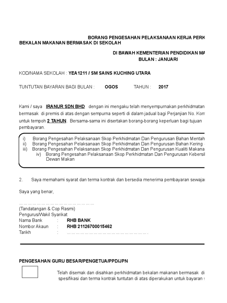 Penggunaan format baru pengesahan perlaksanaan kerja tender perkhidmatan bekalan makanan bermasak bmb di sekolah.