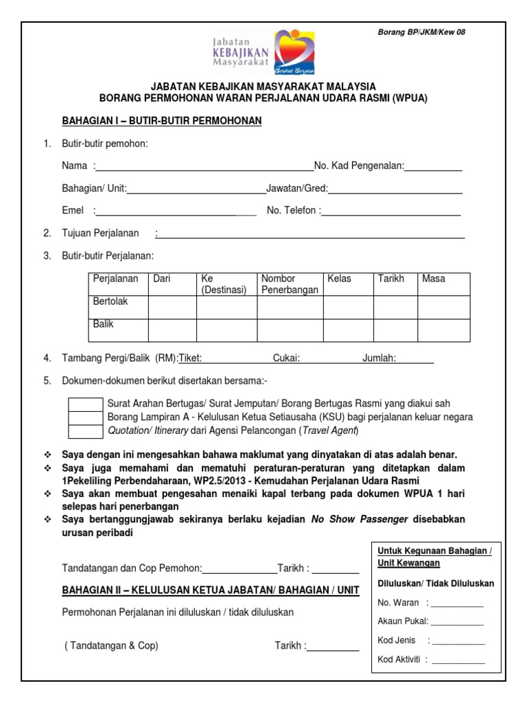 Rasmi wpua bahagian i butir butir permohonan. Permohonan waran perjalanan udara. Borang bp jkm kew 02 kenyataan tuntutan elaun perjalanan luar negeri nama huruf besar no. Di awal penubuhannya pada bulan julai 1922 jabatan yang dikenali sebagai the office of the director of co operation ini berfungsi untuk menubuh mendaftar dan membangunkan syarikat bekerjasama sama di bawah enakmen.