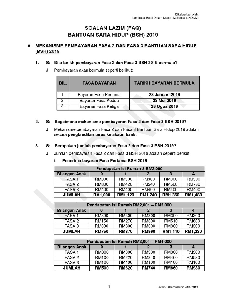 Lembaga hasil dalam negeri malaysia lhdnm 2 tarikh dikemaskini. Tarikh pembayaran bsh 28 mei 2019. Pemohon lulus bsh 2019 yang tidak layak menerima bayaran fasa 1 bsh 2020 adalah seperti berikut. Bayaran bsh fasa kedua akan dilaksanakan mulai 28 mei 2020 pembayaran bantuan sara hidup bsh 2020 fasa kedua akan dilaksanakan mulai 28 mei ini membabitkan hampir 3 6 juta penerima dengan anggaran peruntukan sebanyak rm1 42 bilion.