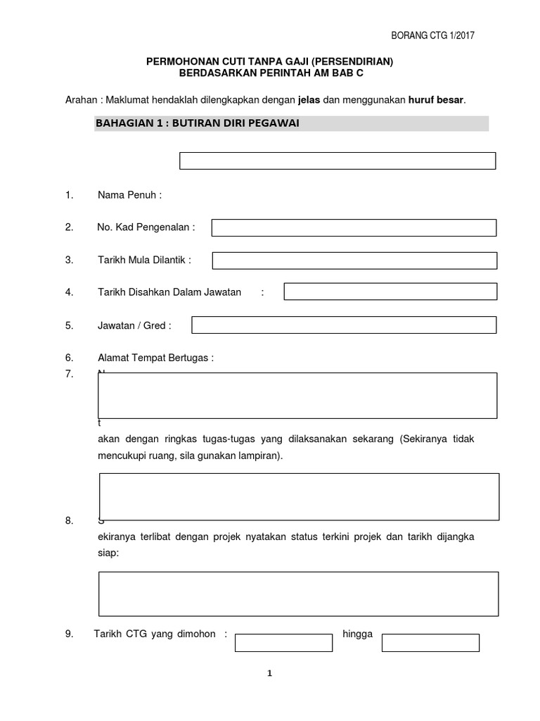 24 04 2013 66 99 kb 3 323. Borang permohonan cuti tanpa gaji ctg bahagian a. Borang permohonan ctg persendirian. Tindakan tanda catatan 1.