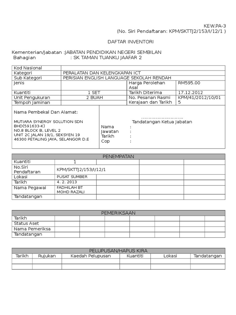 Kew pa 3 daftar inventori kementerian jabatan. Jenis harta modal lokasi daftar kew pa 2 keadaan harta modal lengkap kemaskini catatan mengikut rekod sebenar ya tida tidak ya. Daftar harta modal 15 kew pa 2 penjelasan daftar harta modal 16 daftar inventori 18 kew pa 3 penjelasan daftar inventori 29 kew pa 4 senarai daftar harta modal 20 kew pa 5 senarai daftar inventori 21 kew pa 6 daftar pergerakan harta modal dan inventori 22 kew pa 7 senarai aset alih kerajaan 23 kew pa 8 laporan tahunan harta modal dan. Sila ambil perhatian bahawa laman yang akan dipaparkan selepas pengalihbahasaan secara automatik oleh komputer.