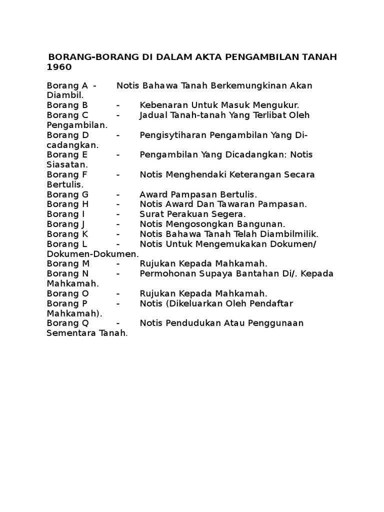 Berdasarkan seksyen 16 1 akta pengambilan tanah pentadbir tanah hendaklah menyediakan dan menyampaikan suatu notis dalam borang h kepada setiap orang yang berkepentingan pada tanah itu seksyen 29 1 pula menyatakan. Di atas sebab sebab yang disebutkan di bawah seksyen 37 akta pengambilan tanah 1960 mana mana orang yang berkepentingan atau pihak yang bagi pihaknya tanah itu diambil boleh melalui pt membuat rujukan. Borang h adalah notis award perintah dan tawaran pampasan. Segera borang i bangunan borang k bicara borang j award pampasan borang g borang h bantahan terima borang n deposit deposit pampasan ke mahkamah rujuk borang o ke mahkamah tambah mahkamah kekal kurang bayar balik tambahan bayar denda lewat bayar pampasan.