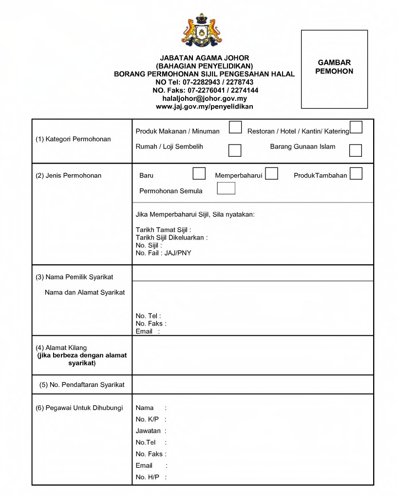 150 000 dalam negeri rp 200 000 luar negeri pas photo ukr 3x4 2 lembar pemilik. Do you separate halal and non halal product at the following areas. 1 4 surat pernyataan tentang sistem jaminan halal sjh borang d 1 dan d 2. Tkt 2 jalan elizabeth ii kementerian hal ehwal ugama lama.