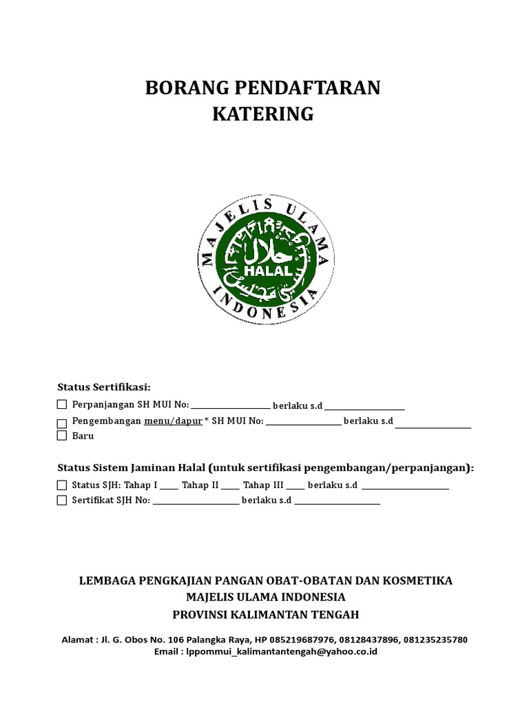 Borang halal. Setelah sukses dengan pelatihan interpretasi dan implementasi sistem jaminan halal pi2sjh tahun 2018 kemarin. Atau borang permohonan bolih diperolehi daripada kaunter berikut. Permohonan sijil pengesahan halal bagi pasaran di peringkat pasaran tempatan permohonan hendaklah dipohon terus kepada jain main mana yang berkenaan. 2 1 sertifikat halal mui atau lembaga lain yang diakui mui untuk bahan yang digunakan.