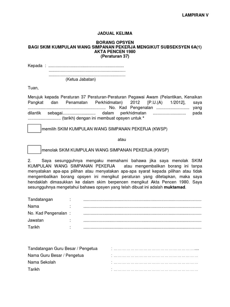 Borang opsyen bagi skim kumpulan wang simpanan pekerja mengikut subsekyen 6a 1 akta pencen peraturan 37 jadual kelima lampiran b muat turun. Perakuan pemberian taraf berpencen peraturan 38 saya dengan ini mengesahkan bahawa. Tahun perkhidmatan yang boleh dimasuk kira dan saya dengan ini memperakukan pegawai ini untuk diberi taraf berpencen. Borang opsyen bagi skim kumpulan wang simpanan pekerja mengikut subsekyen 6a 1 akta pencen peraturan 37 jadual kelima lampiran b pekeliling spp bil.