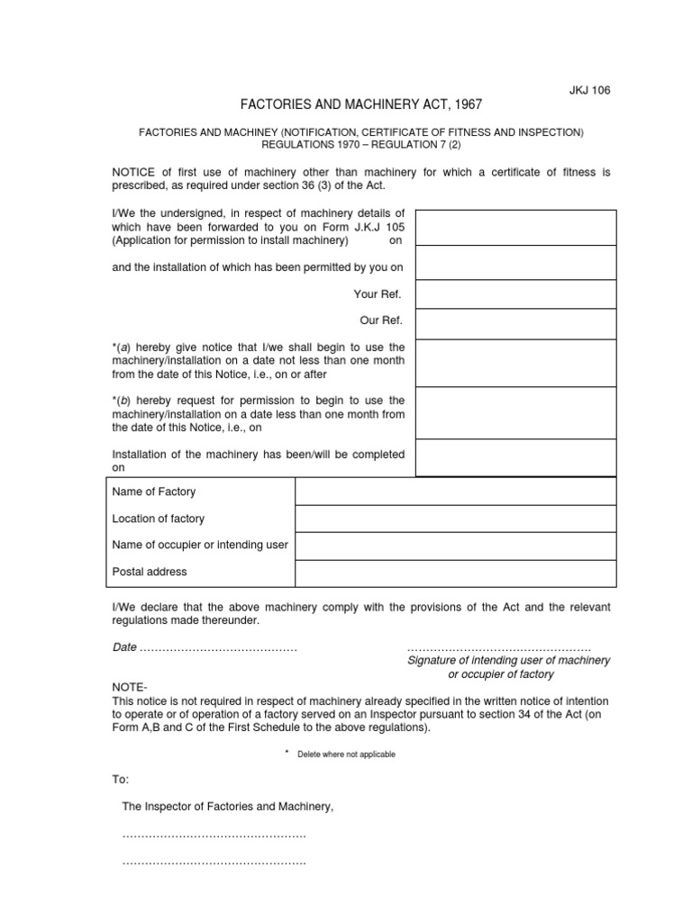 Notification in respect of permission to install machinery and issue of certificate of fitness in respect of steam boiler unfired pressure vessel or hoisting machine not being a hoisting machine driven by manual power jkj 105 popular. Kos projek pembinaan bernilai kurang daripada rm20 juta memerlukan sekurang kurangnya seorang sss sahaja permohonan yang lengkap diterima akan diproses dalam masa 30 hari waktu bekerja. A kebenaran memasang jentera di bawah seksyen 36 1 akta tersebut dan. Borang ini telah dibangunkan dengan konsep membenarkan kesemua maklumat yang diperlukan kecuali tandatangan terus diisi ditaip dengan menggunakan komputer.