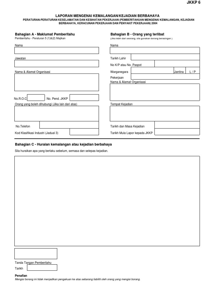 Date of submission of jkkp 6. Hazard fizikal di ladang sawit. 5 3 urusetia bertanggungjawab mengisi dan menghantar borang jkkp 6 jkkp 7 kepada jabatan keselamatan dan kesihatan pekerjaan terengganu. Area of accident refer table 4 14.