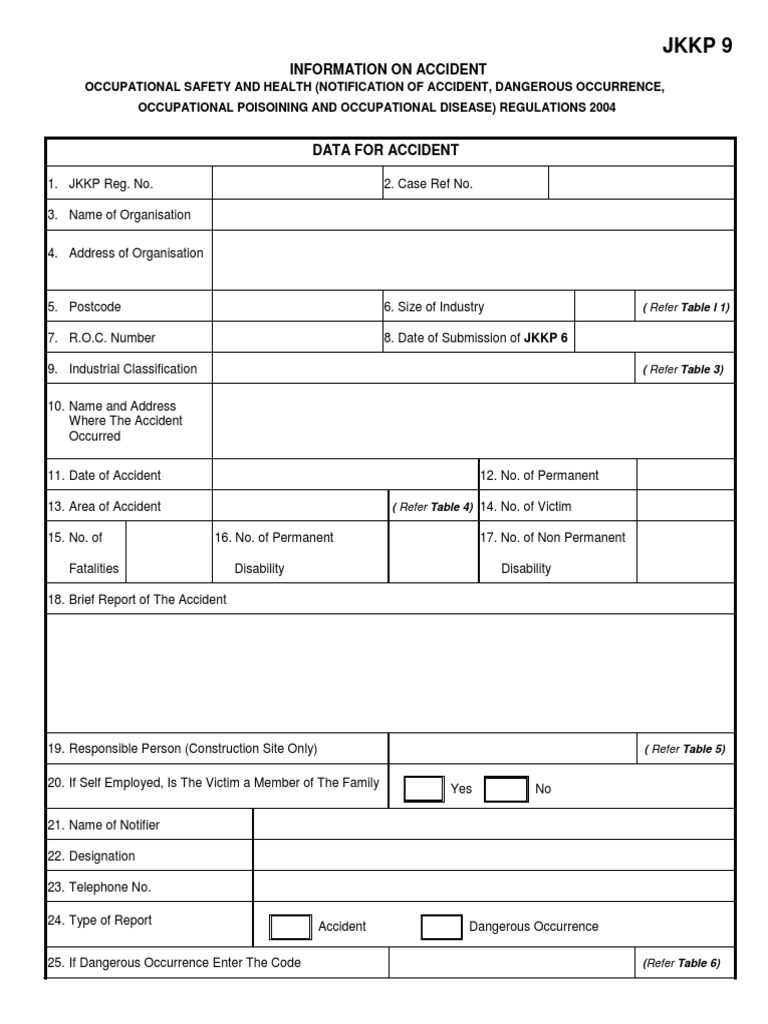 Borang jkkp9 free download as pdf file pdf text file txt or read online for free. Borang aduan penyiasatan dosh jkkp 6 pemberitahuan mengenai kemalangan kejadian berbahaya jkkp 7 pemberitahuan mengenai keracunan pekerjaan penyakit pekerjaan jkkp 8 daftar kemalangan kejadian berbahaya keracunan pekerjaan dan penyakit pekerjaan jkkp 9 data kemalangan. Jkkp 9 maklumat berkaitan kemalangan mukasurat ini untuk kegunaan jkkp sahaja maklumat penyiasatan 1. Hantar dokumen dokumen tersebut kepada jkkp putrajaya.