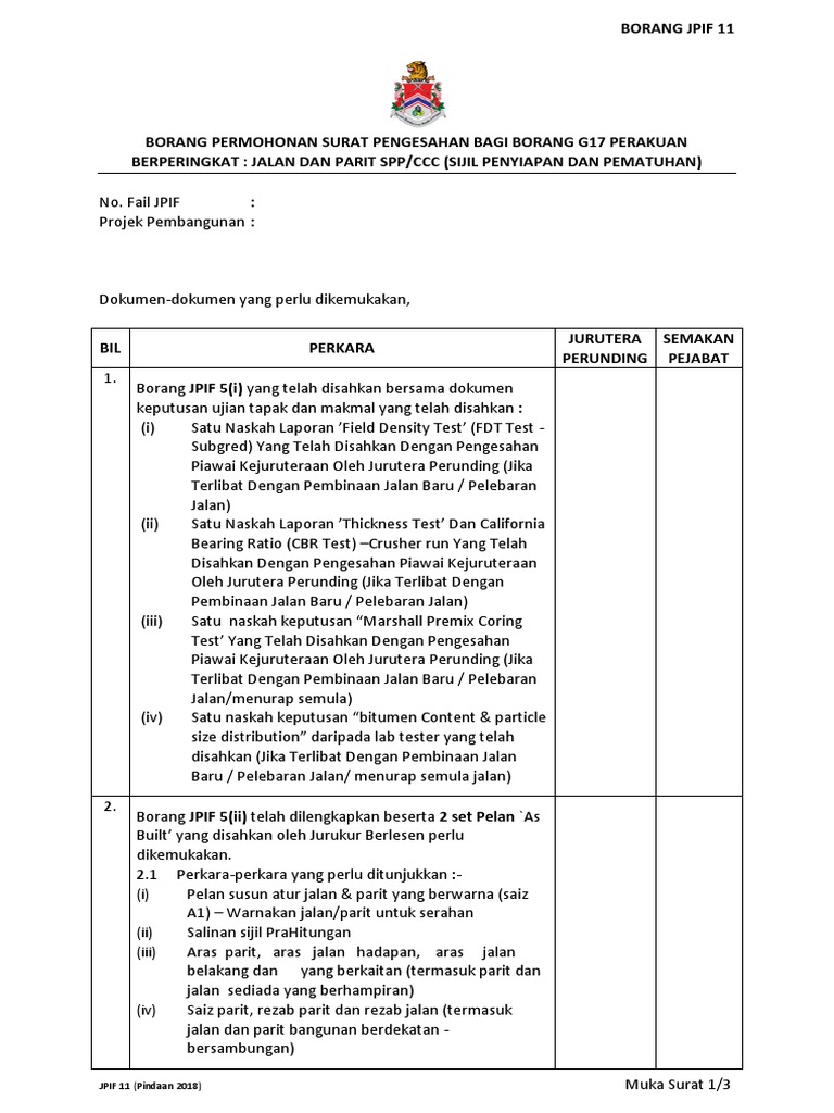 Borang jpif 11. Borang jpif 11 jpif 11 pindaan 2018 muka surat 2 3 bil perkara jurutera perunding semakan pejabat vi v kedudukan perabut jalan nama jalan lorong dan lengkap dengan pentujuk seperti mana keadaan ditapak aras cerun potongan tanah dan tambakan tanah sekiranya ada dan aras kawasan sekeliling 10 m vii kolam takungan banjir osd 2 2. Borang jpif 11. Borang jpif keperluan sistem pengurusan air hujan spah untuk agihan ke unit saliran jpif. Borang jpif 3.