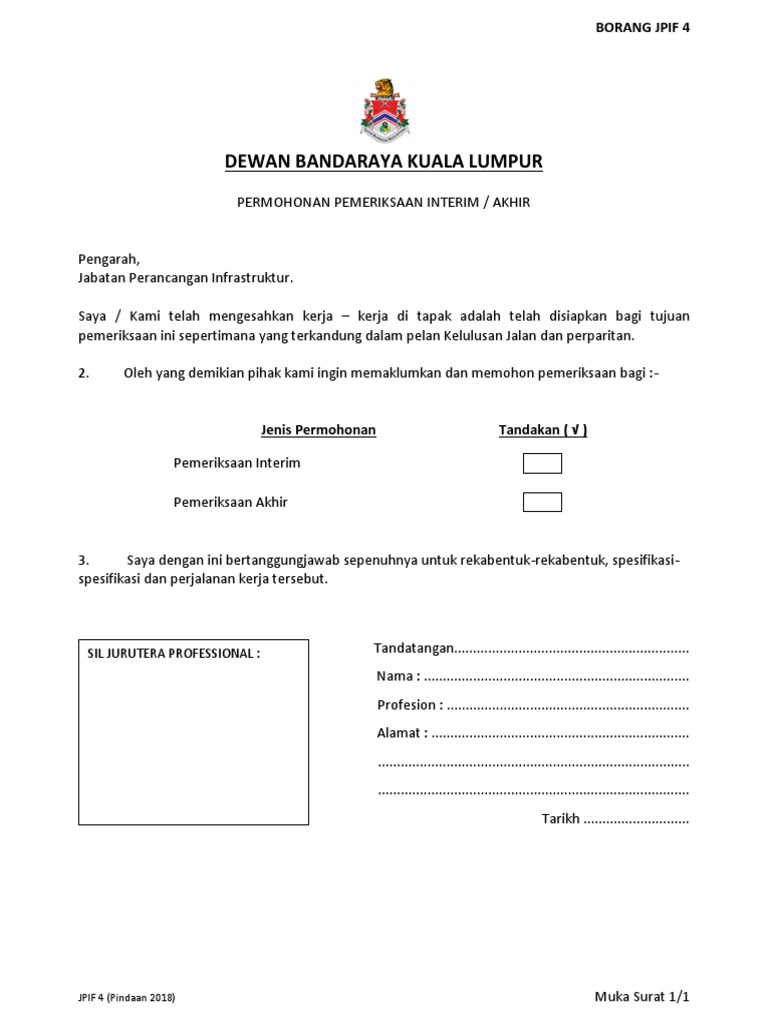 Here you see the selected files to the download. Licensing petty traders. Home e form infrastructure planning departmentborang jpif 3. Muka surat 1 2 borang jpif 1 dahulunya borang jka 1 pindaan april 2014 dewan bandaraya kuala lumpur jabatan perancangan infrastruktur borang pengemukaan pelan dari perunding dan pengesahan dari pemilik pemaju pengarah jabatan perancangan infrastruktur saya kami dengan ini mengemukakan cadangan bagi kerja kerja.