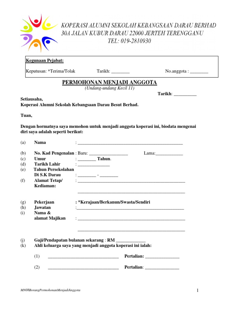 Lantai 15 bangunan tabung haji 201 jalan tun razak 50400 kuala lumpur tel. Pencadang dan penyokong hendaklah terdiri dari anggota anggota koperasi ini sahaja pencadang jika ada penyokong jika ada nama e nama e no. Borang permohonan menjadi anggota member application form pemberhentian ahli koperasi sejati berhad dan pemberhentian potongan gaji yuran keahlian di perkhidmatan biro angkasa member resignation. Pemberhentian potongan yuran dan saham anggota mengambil masa sebulan atau mengikut tarikh akhir yang dituntut oleh angkasa.
