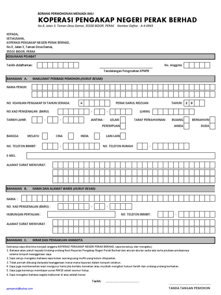 Akhir kata saya menyeru semua rakan anggota lembaga dan pengurusan supaya terus memberikan komitmen dan tanggungjawab yang sepenuhnya dengan rasa ikhlas amanah dan jujur dalam mendukung dan merealisasikan visi dan misi kpjb. Potong yang tidak berkenaan. 2 borang permohonan anggota. 603 2273 2162 603 2273 0552.