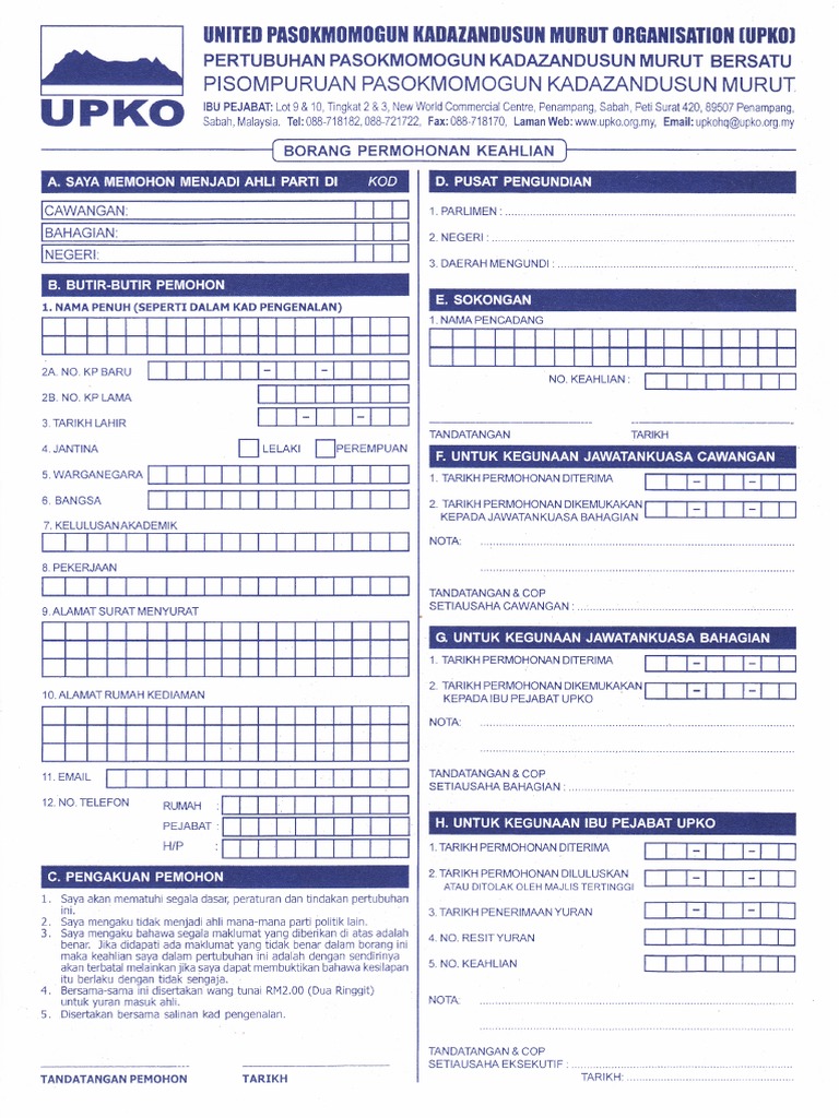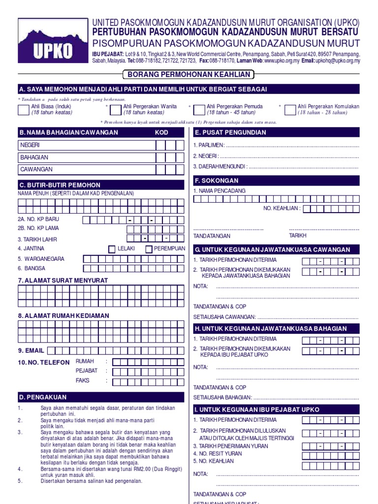 Turut kelihatan ewon kiri dan donald kanan. Sehinggalah hari ini kelmarin saya terpanggil untuk hadir sendiri untuk mengisi dan menyerahkan borang keahlian kepada presiden upko. Serah borang keahlian umno 15 october 2018 berita bergambar pensiangan 14 oktober ketua pemuda umno datuk dr asyraf wajdi dusuki menerima borang keahlian umno daripada salah seoraang wakil ahli pertubuhan pasokmomogun kadazandusun murut bersatu upko ketika hadir pada majlis semarak semangat menjulang maruah bangkit kembali di daerah kecil. Kehilangan seorang permimpin dalam pertubuhan progresif kinabalu bersatu upko bahagian beaufort khususnya di kuala penyu tidak sama sekali mematahkan semangat perjuangan parti berkenaan.