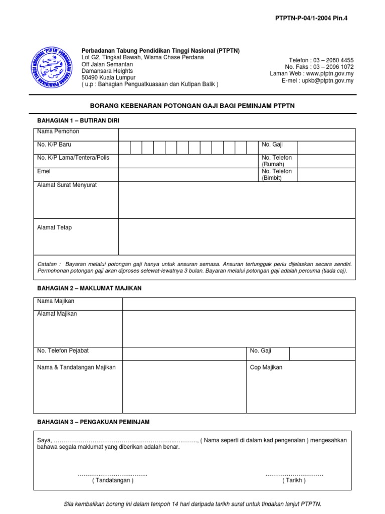 Borang kebenaran potongan gaji ptptn. Seterusnya ptptn akan mengemas kini rekod potongan gaji ke dalam sistem ptptn dan mengemukakan jumlah potongan gaji tersebut kepada majikan. Borang kebenaran potongan gaji skim thohir salinan ppz maiwp yang telah diproses oleh majikan hendaklah dihantar ke pusat pungutan zakat majlis agama islam wilayah persekutuan ppz maiwp berserta dengan cek pembayaran. Langkah pertama peminjam dikehendaki melengkapkan borang kebenaran potongan gaji yang terdapat di portal rasmi ptptn dan menyerahkannya bersama sama salinan slip gaji terkini di mana mana cawangan ptptn. Mulai september 2015 semua penjawat awam yang menerima pinjaman ptptn diwajibkan membuat bayaran balik pinjaman melalui potongan gaji.