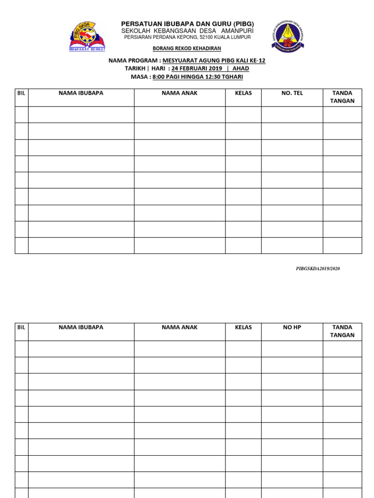 Borang kehadiran mesyuarat agung pibg. Sekiranya kuorum untuk mengadakan mesyuarat agung tahunan tidak mencukupi dalam tempoh 1 jam dari masa yang ditetapkan mesyuarat tersebut hendaklah dibatalkan dan jawatankuasa pibg hendaklah mengeluarkan notis bertulis kepada anggota persatuan memaklumkan tarikh baru mesyuarat agung tahunan dalam masa 30 hari dari tarikh asal tersebut. 1 kehadiran ahli ahli pibg direkod. 1 borang usul dibekalkan kepada ahli pibg sebelum mesyuarat agung pibg. Ketika menghadiri mesyuarat pibk penglibatan ibubapa dan komuniti di penghujung march baru baru ini memberikan info sekolah saya belum pernah mendaftaran pibg.