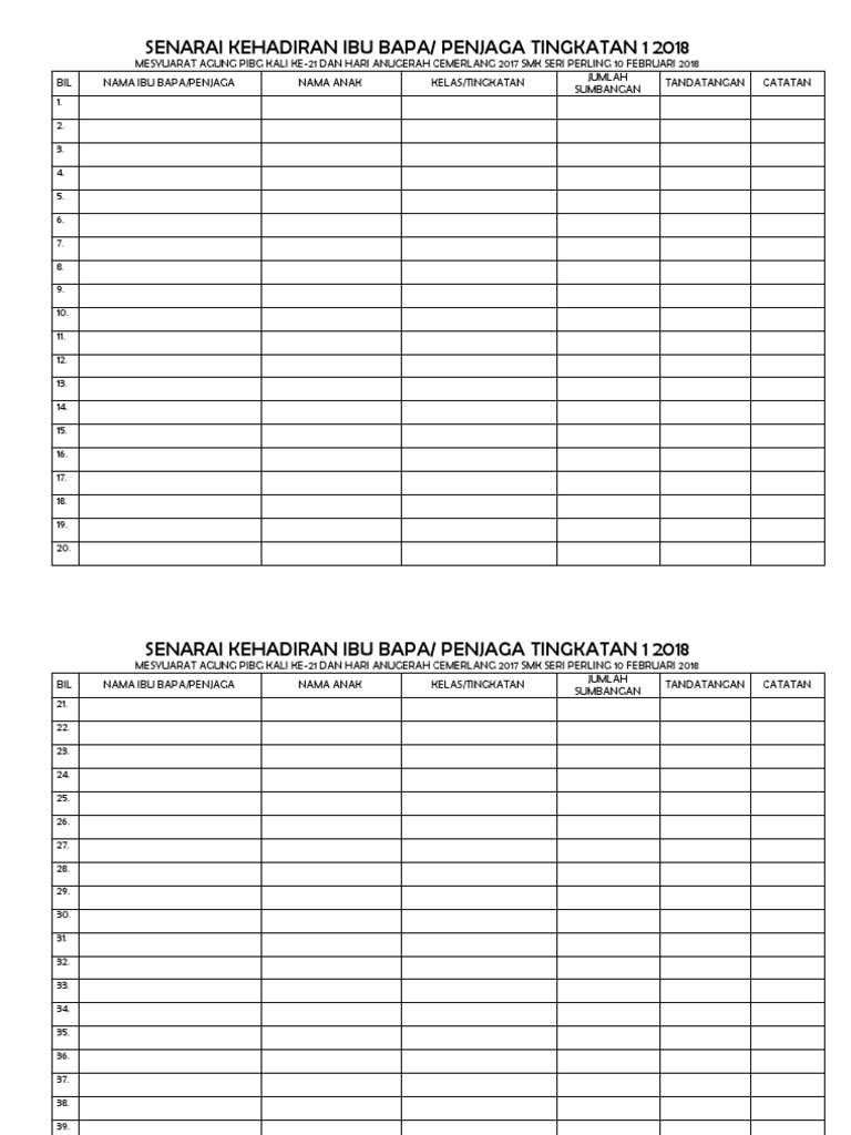 Tarikh akhir penghantaran borang pencalonan pada 18hb. Mesyuarat agung tahunan jika mesyuarat agung tahunan tidak diadakan sebelum akhir bulan mac jawatankuasa pibg hendaklah mengemukakan alasan dan tarikh yang dicadangkan kepada pendaftar melalui guru besar atau pengetua sebelum 31 mac. Template kehadiran secara manual pun ada. Membuat pengumuman semasa perhimpunan dijalankan guru kelas dan mentor guru bertugas mingguan 11 0 kaedah pemantauan 11 1 borang usul borang jawapan kehadiran 11 2 borang maklumbalas ajk pibg smk cheras 12 0 penutup.