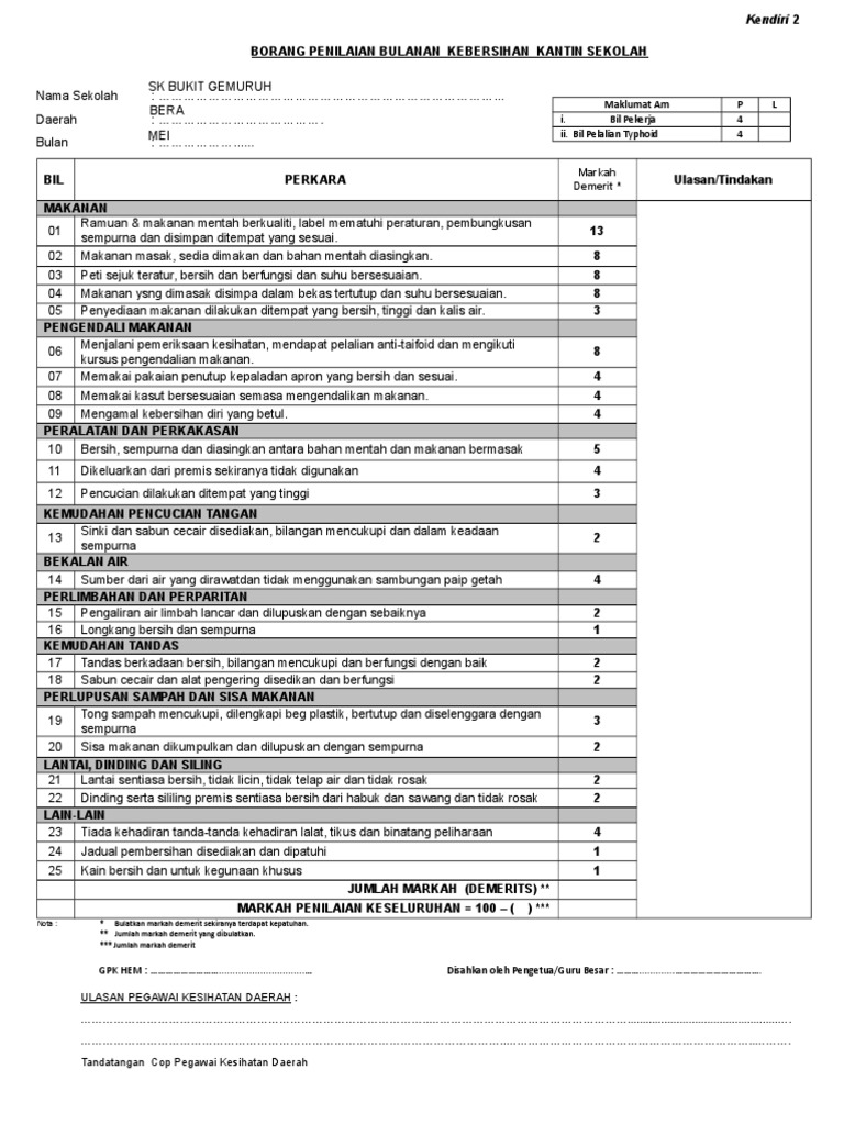 0 0 mendukung tandai dokumen ini sebagai bermanfaat 0 0 menolak tandai dokumen ini sebagai tidak bermanfaat tanamkan. Borang kendiri 1a 1b 2 2011 laporan pemeriksaan kendiri kantin dan dapur as. Kenyataan sebutharga b ppd sh 13 penilaian bulanan kebersihan kantin penilaian bulanan kebersihan kantin aduan tentang kegiatan lumba haram jabatan kesihatan negeri melaka aduan tentang kegiatan lumba haram. Kad pengenalan nama jawatan gred kod nama sekolah ppd bil.
