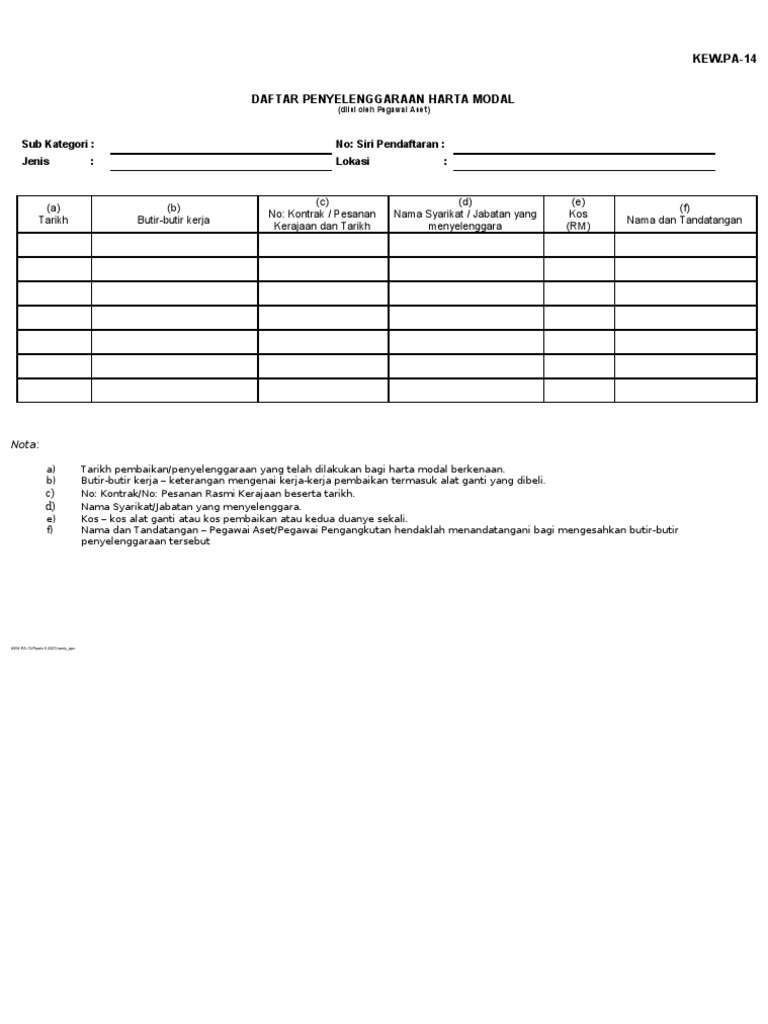 Pekeliling perbendaharaan malaysia kp 6 6 2013 lampiran a lampiran a kew ps 14 kementerian jabatan. Save save kew pa 14 daftar penyelenggaraan harta modal for later. Tahun semasa kedudukan stok kadar pusingan stok c a d 2 sedia ada pembelian pengeluaran stok semasa bilangan stok jumlah nilai stok rm bilangan stok jumlah nilai stok rm bilangan stok jumlah nilai stok rm bilangan stok jumlah. Pekeliling perbendaharaan malaysia kp 2 5 2013 lampiran d m s.