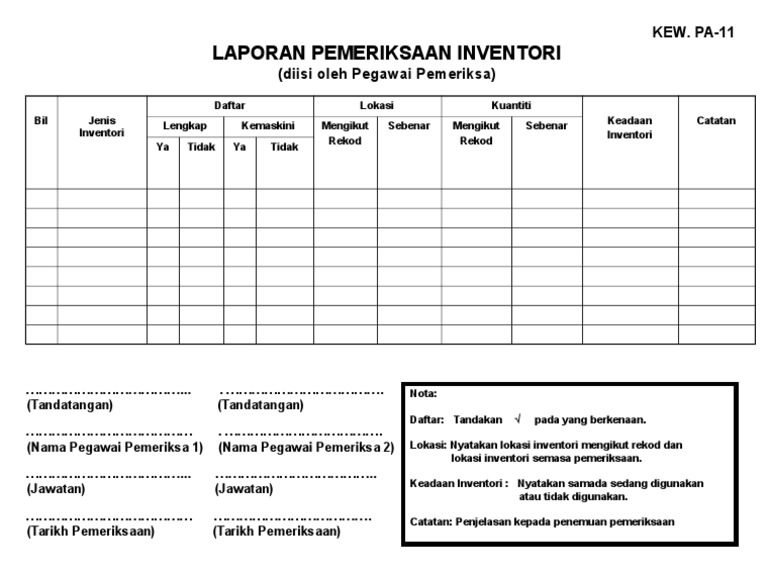 Kew pa 11 laporan pemeriksaan inventori diisi oleh pegawai pemeriksa bil jenis inventori daftar lokasi kuantiti keadaan inventori lengkap kemaskini. 5 4 6 menandatangani kew pa 19 dan mengemukakan kepada jabatan. Sk jalan haji baki. Borang pelupusan aset alih borang pelupusan aset alih kew pa 21 lampiran c hendaklah disediakan seperti berikut 6 1 kew pa 21 hendaklah disediakan oleh kementerian atau jabatan ptj yang bercadang untuk melaksanakan pelupusan.