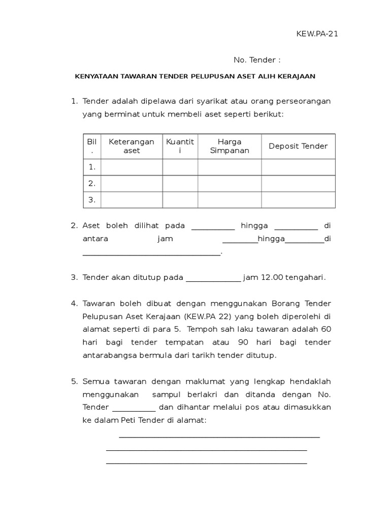 Borang kew pa 21. Kenyataan tawaran tender pelupusan aset alih kerajaan 1. Aset boleh dilihat pada hingga di antara jam. Pa pengurusan aset alih kerajaan bil. Borang pelupusan aset alih kew pa 21 lampiran c hendaklah disediakan seperti berikut 6 1 kew pa 21 hendaklah disediakan oleh kementerian atau jabatan ptj yang bercadang untuk melaksanakan pelupusan.