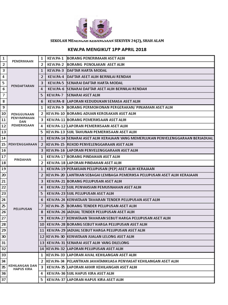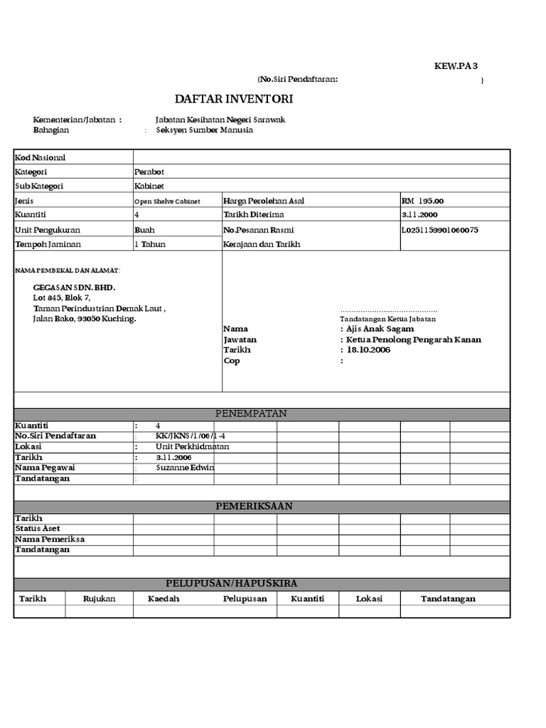 Borang kew pa 22 terbaru. E borang kew pa 1 yang disahkan dan ditandatangani oleh ketua jabatan dihantar kepada ejen pembekal syarikat dengan serta merta. Unit rekod aset stor bekalan pejabat bendahari utem monday 13 may 2013. 7 7 3 salinan resit jualan borang akuan penerimaan bagi buangan terjadual sisa pepejal. Dan 7 7 4 sijil penyaksian pemusnahan aset alih kew pa 22 lampiran e bagi aset alih yang dilupuskan melalui kaedah musnah dan tenggelam.