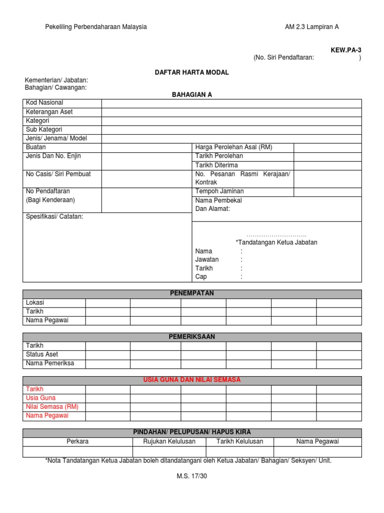 Borang kew pa 3 daftar harta modal. Siri keterangan tarikh perolehan justifikasi keputusan guna semasa keadaan kaedah pendaftaran aset perolehan asal kuasa catatan aset rm aset pelupusan melulus rm. Daftar harta modal 15 kew pa 2 penjelasan daftar harta modal 16 daftar inventori 18 kew pa 3 penjelasan daftar inventori 29 kew pa 4 senarai daftar harta modal 20 kew pa 5 senarai daftar inventori 21 kew pa 6 daftar pergerakan harta modal dan inventori 22 kew pa 7 senarai aset alih kerajaan 23 kew pa 8 laporan tahunan harta modal dan. Pekeliling perbendaharaan malaysia am 2 3 lampiran a. A daftar harta modal kew pa 3 seperti di lampiran a.