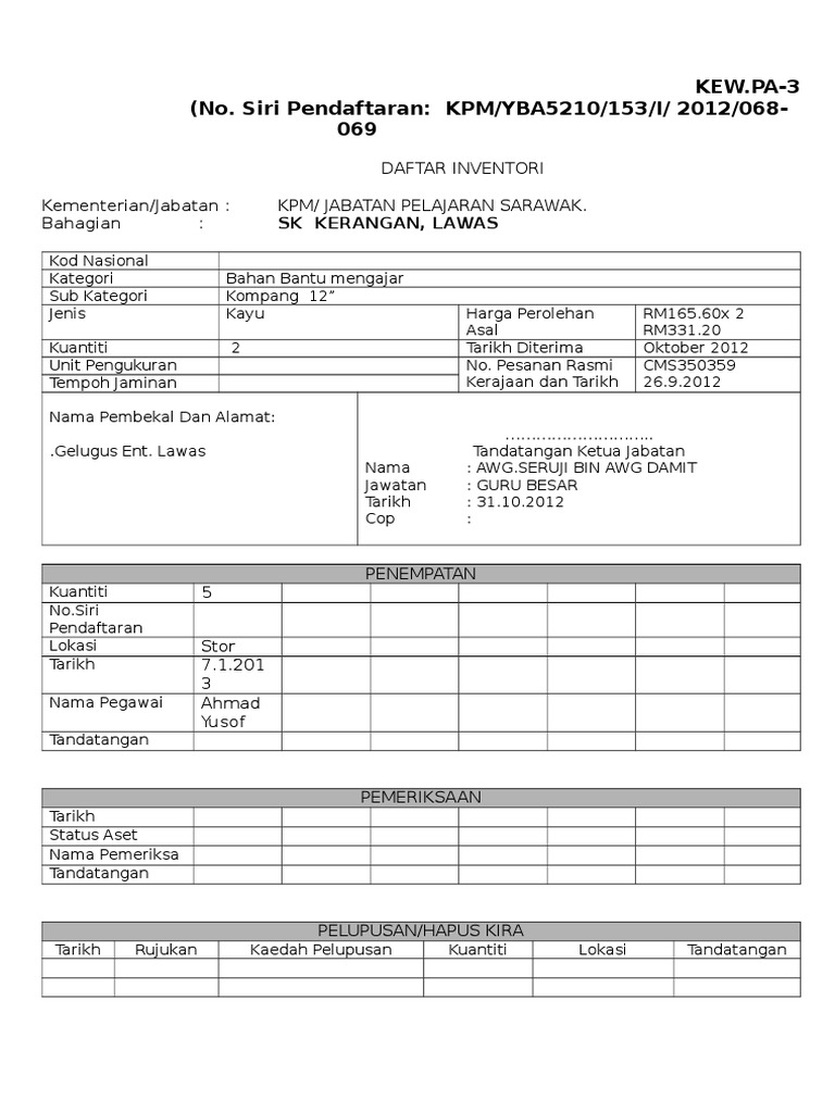 Borang kew pa 3. Borang tambang percuma mengunjungi wilayah asal lampiran a1. Kod nasional kategori sub kategori jenis harga perolehan asal kuantiti tarikh diterima unit pengukuran no. Bahagian i untuk diisi oleh pegawai aset 1. Kew pa 3 contoh pengisian angkatan sasterawan 50.