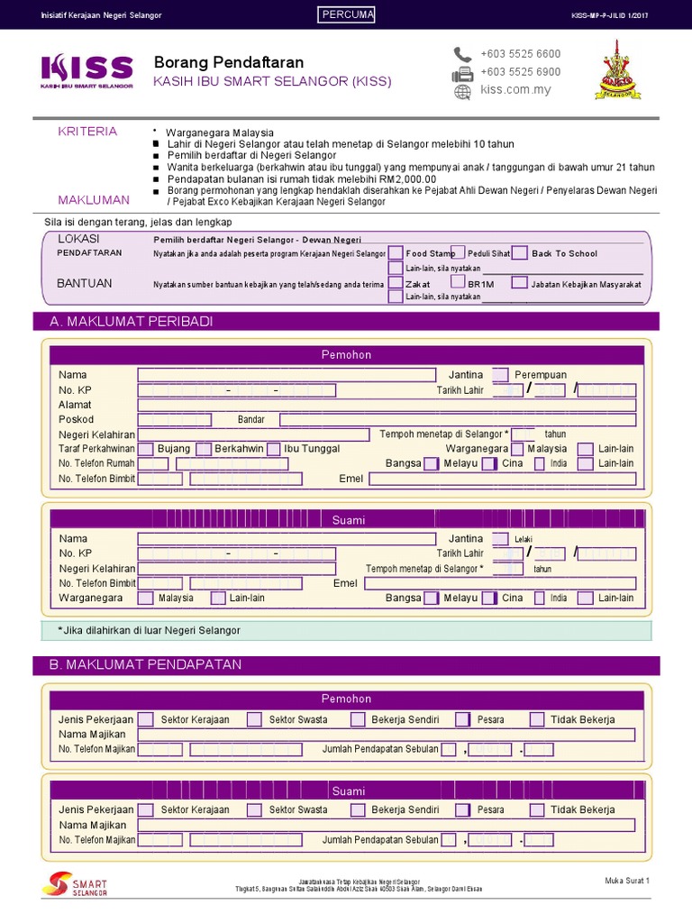 Borang pendaftaran kasih ibu smart selangor kiss 603 5525 6900 603 5525 6600 sila isi dengan terang jelas dan lengkap inisiatif kerajaan negeri selangor percuma kiss mp p jilid 1 2017 a. Admission kuis edu my di dalam bentuk pdf. Layari laman web kiss. Sila buat pendaftaran secara manual sehingga applikasi online diperkenalkan.