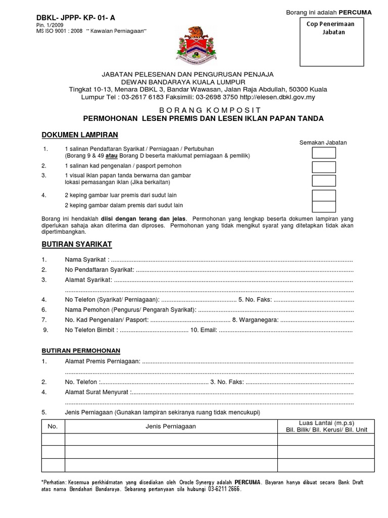 Mengisi borang permohonan yang boleh diperolehi di kaunter jabatan yang bertempat di tingkat 4 menara dbkl 2 borang boleh didapati secara percuma atau secara on line dengan melayari laman web https elesen dbkl gov. Memuat turun borang permohonan dan menghantar borang tersebut ke kaunter kaunter pendaftaran seperti di atas. 1 salinan pendaftaran syarikat perniagaan pertubuhan borang 9 24 49 act 777 seksyen 14 seksyen 58 atau borang d beserta maklumat perniagaan pemilik 2.