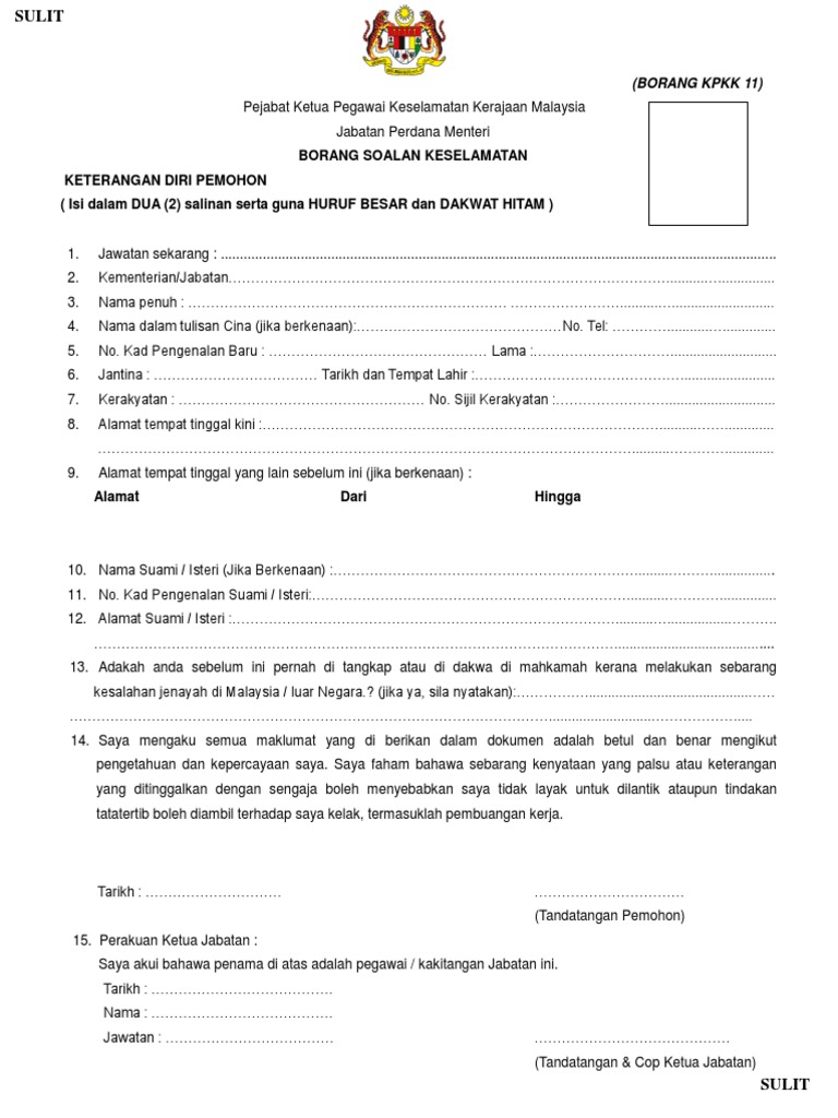 Pejabat ketua pegawai keselamatan kerajaan malaysia borang kpkk 11 jabatan perdana menteri. Penuhkan setiap ruangan kosong. Jika ruangan tidak mencukupi kepilkan dengan lampiran lain. Setiap permohonan perlu disertakan dengan surat iringan dari jabatan sekolah yang mempunyai nombor rujukan.
