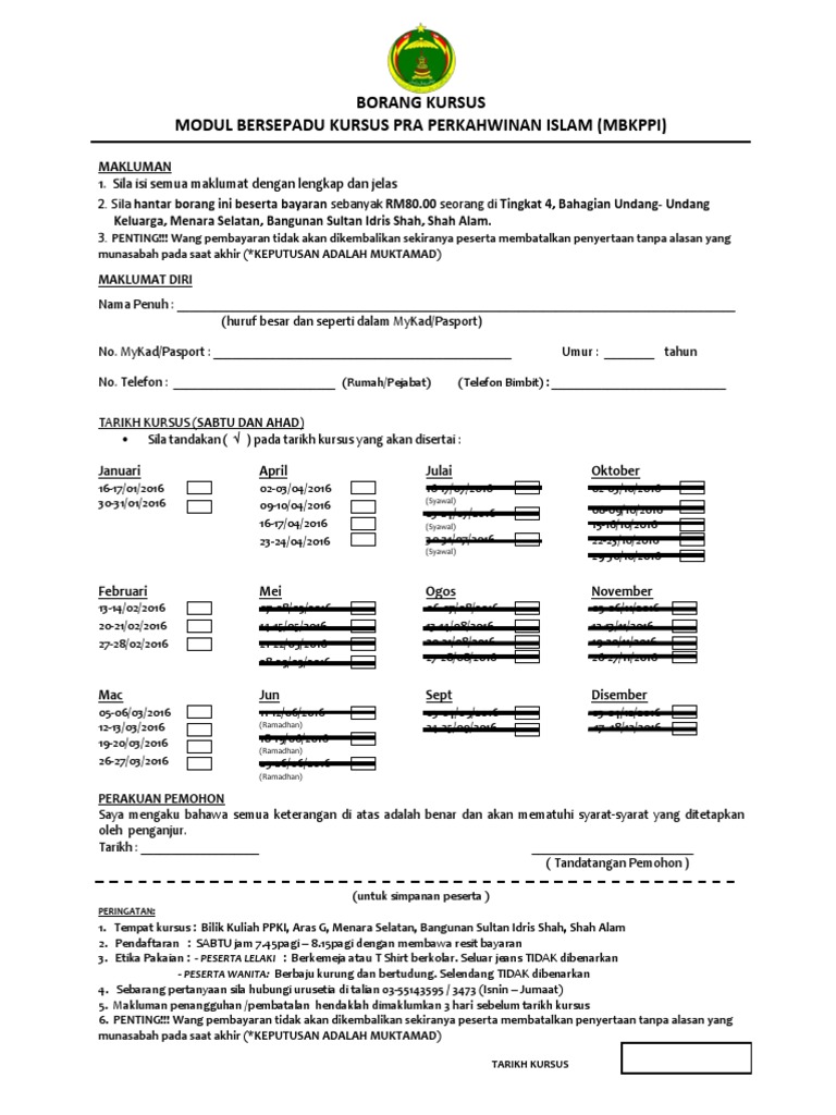 Borang kursus pra perkahwinan. Permohonan pendaftaran ruju luar. Kursus dijalankan pada hujung minggu dan ambil masa selama dua hari. Status perkahwinan alamat di selangor tidak perlu tekan enter untuk memasukan alamat daerah sila pilih petaling gombak klang kuala langat sepang hulu langat kuala selangor hulu selangor sabak bernam lain lain. Pemohon boleh memilih tarikh kursus dan lokasi pilihan yang bersesuaian dan menghantar permohonan secara online.