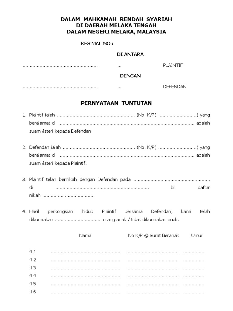 Sila muat turun borang yang tepat untuk dijadikan rujukan. Isi borang cerai di mahkamah untuk kebanyakan negeri boleh tulis tangan tapi kalau di kuala lumpur perlu bertaip ada jurutaip di mahkamah kl tapi perlu bayar khidmat jurutaip jika nak taip sendiri kena cari cyber cafe atau ambil borang dahulu dan taip di rumah siap siap. Plaintif 3 salinan. Pastikan ditaip semula menggunakan komputer.