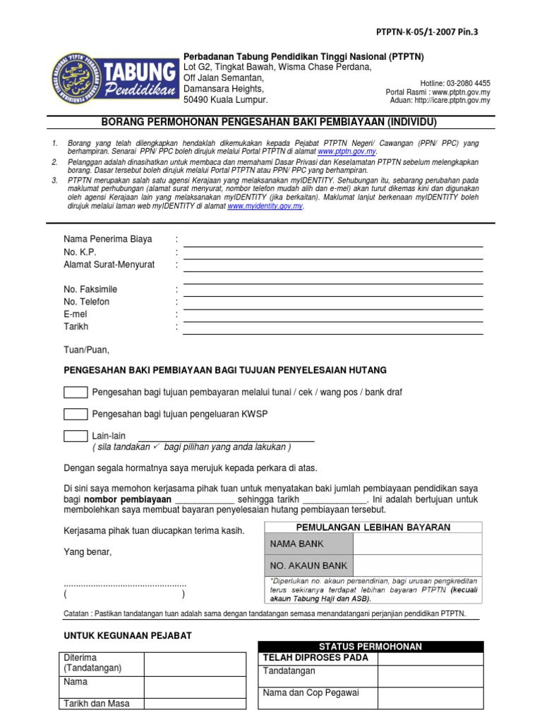 Peminjam tidak perlu menunggu notis emel surat dari pihak ptptn untuk memulakan proses bayaran balik memandangkan penyata baki pinjaman kini boleh disemak secara online sahaja. Mula mula sekali confirm lah kena masuk dulu website ptptn. Bagi mana mana penerima biaya yang diluluskan dan telah membuat bayaran balik pembiayaan pendidikan secara penuh sebahagian ptptn akan membuat pemulangan kepada penerima biaya tersebut setelah ditolak apa apa kos yang berkaitan jika ada. Perbadanan tabung pendidikan tinggi nasional tingkat bawah menara ptptn blok d megan avenue ii no 12 jalan yap kwan seng 50450 kuala lumpur.