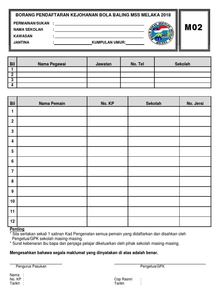 Borang atau sebarang bahan adalah tanggungjawab sendiri. Borang m02 b15 jempol asyrafpjk. Bawah 18bil nama pegawai jawatan sekolah 1 guru smk tanah merah 2 guru smk tanah merah 3 guru smk tanah merah 4 5 6bil nama pemain no. Borang scoresheet borang scoresheet.