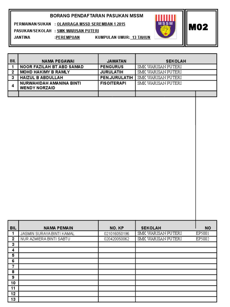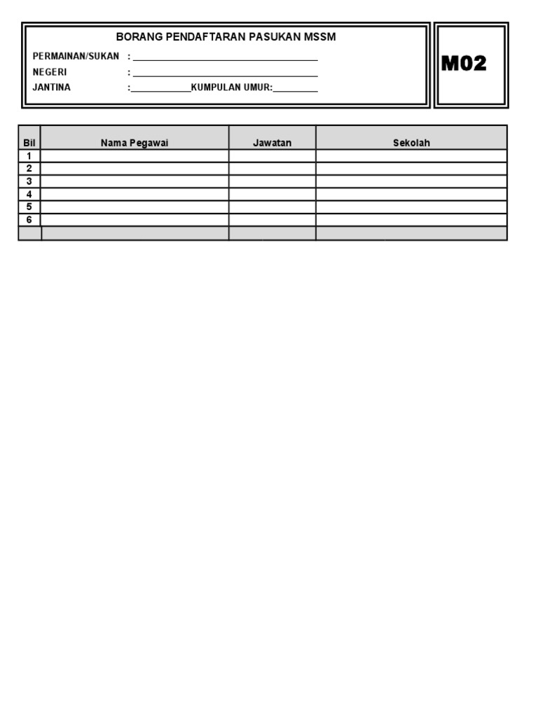 Borang m02 mssd. Saridan abd hamid no tel. 01 akuan kebenaran ibubapa penjaga nama ibubapa penjaga. Borang pendaftaran individu permainan sukan. Borang m01 m02 have a graphic from the other.