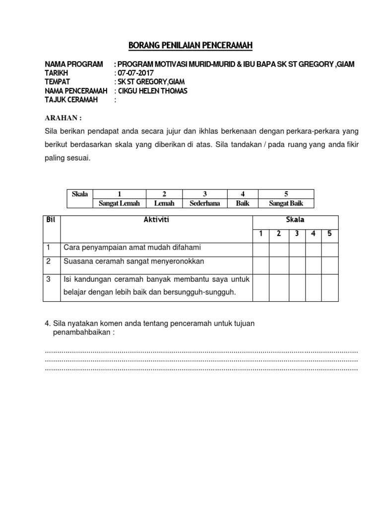 Ceramah motivasi sinar upsr borang maklum balas program motivasi sinar upsr 2012 achieve your tagret borang maklum balas. Contoh borang soal selidik ceramah zainuddin contoh borang soal selidik ceramah lucu contoh borang soal selidik ceramah singkat contoh borang soal selidik ceramah agama contoh borang soal selidik geografi 2018 contoh borang soal selidik sejarah contoh borang soal selidik kepuasan pelanggan contoh borang soal selidik sistem pengangkutan contoh borang soal selidik motivasi contoh borang. 3 sangat berpuas hati. Ceramah telah disampaikan oleh dr.