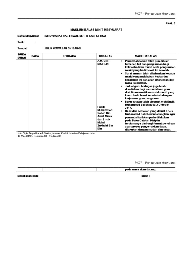 Borang maklum balas minit mesyuarat. Pk07 pengurusan mesyuarat pk07 5. Mesyuarat jawatankuasa pibg bil. Sekolah menengah seksyen 24 borang maklum balas mesyuarat pengurusan bilangan 5 2012 muka surat para p. Muka para perkara tindakan maklum balas surat.