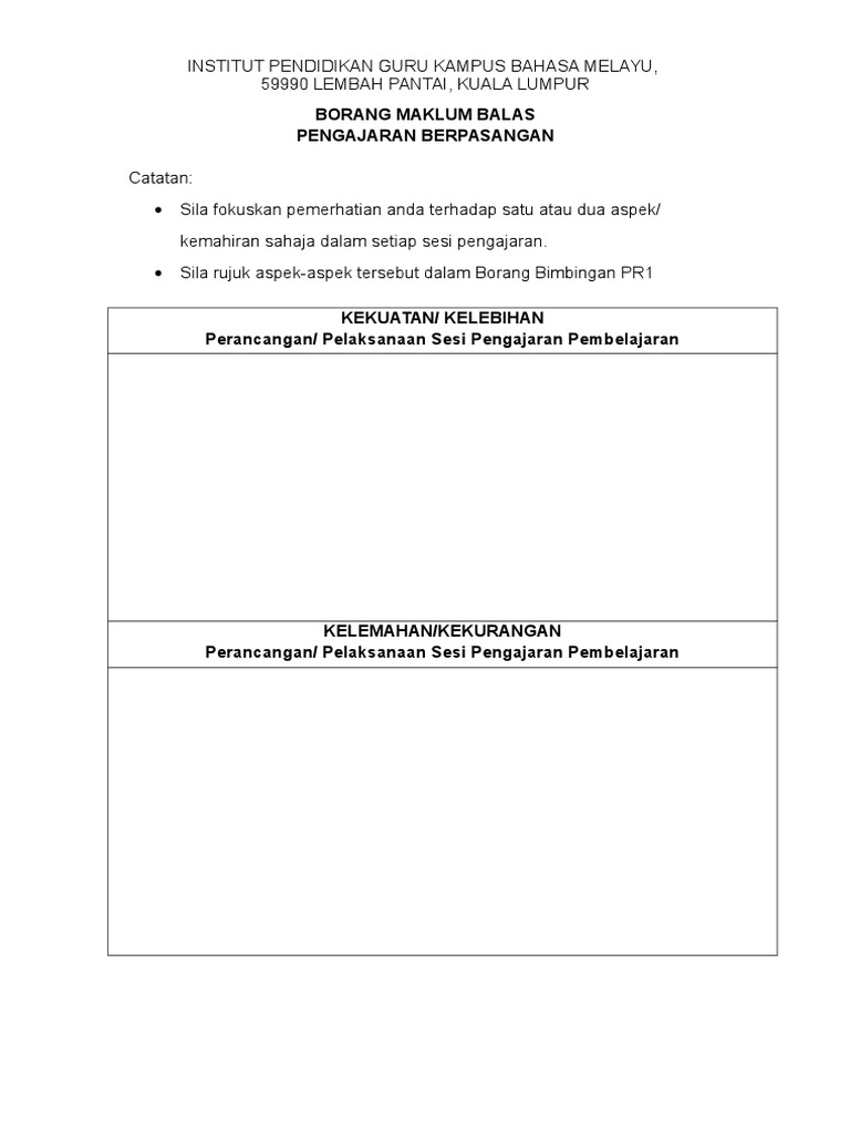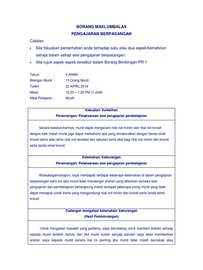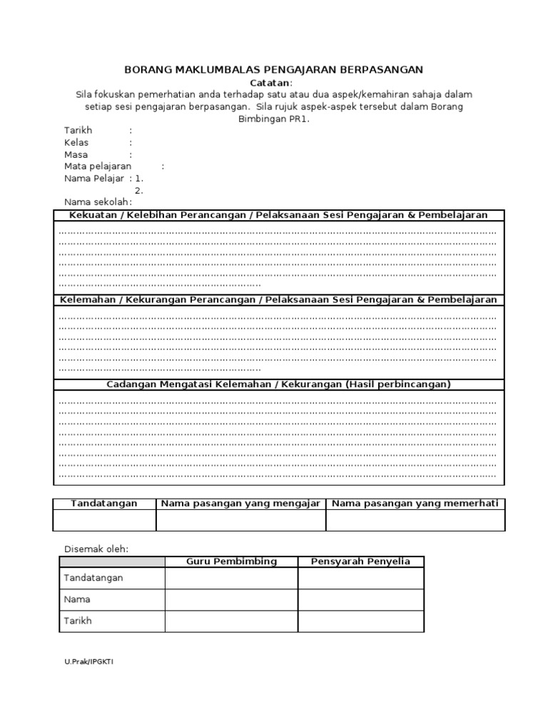 Borang maklum balas pengajaran berpasangan. Scribd is the world s largest social reading and publishing site. Walau bagaimanapun bagi memastikan sistem berjalan dengan lancar sesi percubaan telah. Jawab soalan kemahiran mengajar dan strategi pengajaran. Satu strategi yang melibatkan dua orang pelajar bekerjasama merancang pengajaran pembelajaran memerhati pengajaran rakan sebaya dan memberi maklum balas tentang persediaan dan penyampaian pelajaran semasa praktikum.