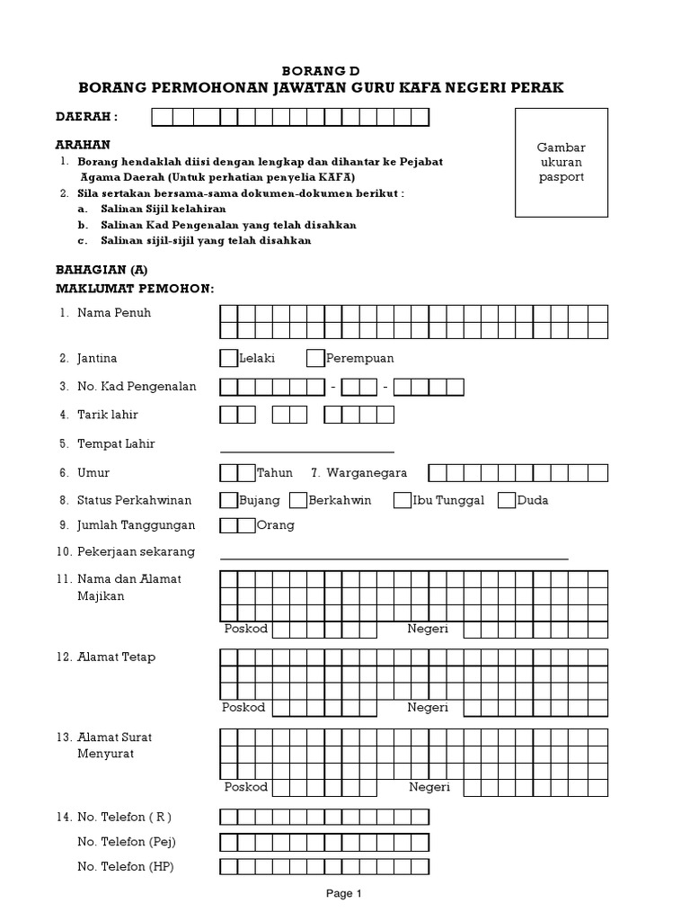 Borang ini hendaklah diisi dengan lengkap dan dihantar ke bahagian pelajaran jabatan agama islam wilayah persekutuan. Sertakan bersama dokumen dokumen yang telah disahkan peg. Borang j cuti tanpa elaun. Borang permohonan jawatan guru kafa.